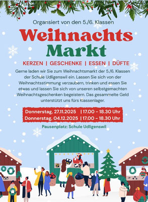 KERZEN | GESCHENKE | ESSEN | DÜFTE- Gerne laden wir Sie zum Weihnachtsmarkt der 5./6. Klassen auf dem Pausenplatz der Schule Udligenswil ein. Lassen Sie sich von der Weihnachtsstimmung verzaubern, trinken und essen Sie etwas und lassen Sie sich von unseren selbstgemachten Weihnachtsgeschenken begeistern. Das gesammelte Geld unterstützt uns fürs Klassenlager. Der Weihnachtsmarkt verzaubert Sie an folgenden Daten: