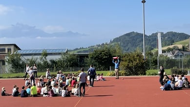 Von 7.30 bis 8.00 Uhr fand ein lustiger und bewegungsreicher Schulstart statt. Zuerst bewegten sich die Kinder mit «Achtung Pingu, rechter Arm, linker Arm, rechtes Bein, linkes Bein, Kopf, Hüfte und Zunge», danach sangen wir ein Laurenzia mit allen Wochentagen, darauf folgte ein «Tschi-Aia» und ein Knoten wurde auch noch aufgelöst. Zum Schluss tanzten wir alle gemeinsam auf dem Schulhausplatz. Vielen Kindern hatte es Spass gemacht und einige spielten auch wie gewohnt Fussball vor der Schule, was auch eine tägliche Bewegung ist. Martin Tiziani, Schulleitung