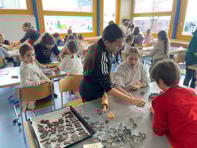 Das Götti-Gotti-System gab die Möglichkeit, gemeinsam in der Weihnachtszeit „Guezli“ zu backen und jemandem eine Freude zu bereiten. Die Kinder der 5./6. Klassen halfen den Schülerinnen und Schülern der 1./2. Klassen und bei Weihnachtsmusik entstanden feine, duftende Mailänderli, Zimetsterne oder Brunzlis.